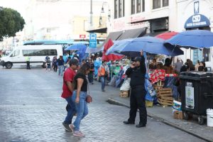 Más de 180 elementos de la Policía Municipal y 50 auxiliares, con apoyo de 70 vehículos, cuidan a más de 400 mil personas que cada día visitan el primer cuadro de la ciudad.