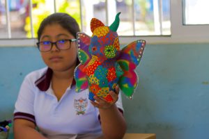 Durante el recorrido, observó el trabajo creativo de las y los adolescentes en la elaboración de alebrijes, actividad que realizan actualmente y que fortalece la identidad cultural, la creatividad y la colaboración. Asimismo, reconoció la labor del equipo de facilitación, integrado por un equipo multidisciplinario, que acompaña de manera cercana el proceso formativo de las juventudes.