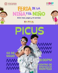 El grupo Picus se presentará este 2 de mayo en el Centro de Espectáculos Montejo del recinto ferial de Xmatkuil, como parte de las actividades organizadas por el Gobierno del Estado, a través del Sistema DIF Yucatán, para celebrar el Mes de la Niña y el Niño.